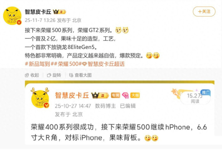 日前,数码博主“智慧皮卡丘”爆料称,“接下来荣耀500系列,荣耀GT2系列。一个普及2亿,果味十足的造型,工艺,一个首款下放骁龙8EliteGen5。特色都非常明确,产品定义越来越自信,爆款预定。”此前该博主曾爆料,“接下来荣耀500继续hPhone,6.6寸大R角,对标iPhone,果味背板。 2亿主摄+潜望长焦的影像定义很吸睛。”