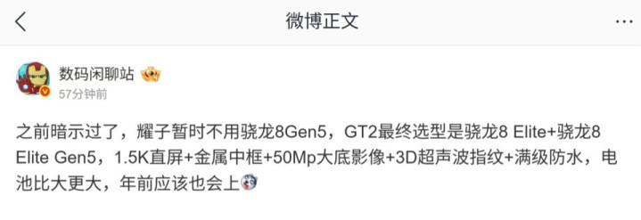 在 @荣耀手机 发布了Magic8系列年度旗舰之后,网间很快再次曝光了荣耀年底前将发布的多款新机的消息,其中包括荣耀500系列、荣耀GT2系列等。从曝光的信息来看,目前貌似荣耀500系列的新机已经入网,荣耀游戏研发工程师 @荣耀冯同学 还透露,该系列新机在影像、电池和性能上都将有很大提升。日前,有数码博主再次爆料, 荣耀500系列和GT2系列一个普及2亿像素,一个搭载骁龙8EliteGen5(高通第五代骁龙8至尊版)处理器。